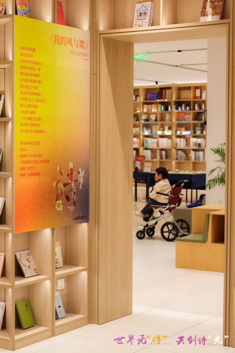 “我扶着手杖,既是音符,也是指挥棒/左脚追问土地,右脚回答海浪/节拍里,我把自己,走成一张活地图/我翻译斜坡的暗语,也懂得台阶的叹息/把每一次颠簸,改写成平坦的韵脚/让后来者的脚印,不再踉跄……”视障者王林与听障者王玉婷以朗诵与手语结合的形式演绎残疾诗人陈艺新创作的《双重奏》。“诗之光”残疾人诗歌作品展览同期展出,让残疾人的才华与心声被更多读者“看见”和“听见”。
